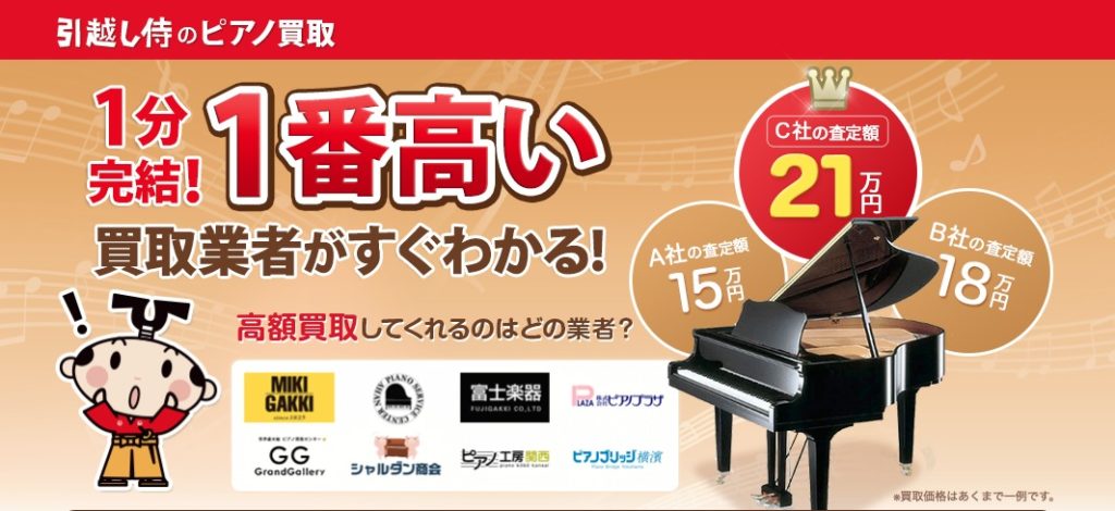 引越し侍のピアノ買取は、一番高く買い取ってくれる買取業者が分かる一括査定サイトです。